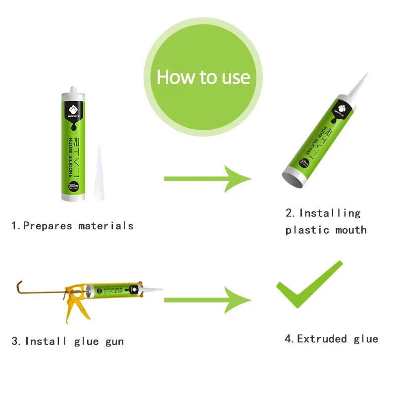 (1) Gumamit ng mga cotton pad ng alkohol upang linisin at matuyo ang ibabaw ng bagay na mai -bonding. Ang mga produktong aluminyo ng tubo/PE tube ay maaaring direktang pinisil at nakadikit ng kamay, o ginamit gamit ang isang pandikit na baril/dispensing machine. (2) Tandaan na pagkatapos mailapat ang pandikit, dapat itong ganap na mailantad sa hangin upang ma -trigger ang pagpapagaling. Ang kapal ng layer ng pandikit ay inirerekomenda na kontrolado sa 2-5mm. Masyadong makapal ay pahabain ang oras ng bulkanisasyon. . Huwag mag -apply ng puwersa bago ito ganap na gumaling. . Iwasan ang pakikipag -ugnay sa mga mata sa panahon ng aplikasyon ng pandikit; Huwag i -seal sa panahon ng konstruksyon at paggamot, at mapanatili ang isang mahusay na kapaligiran sa bentilasyon. .